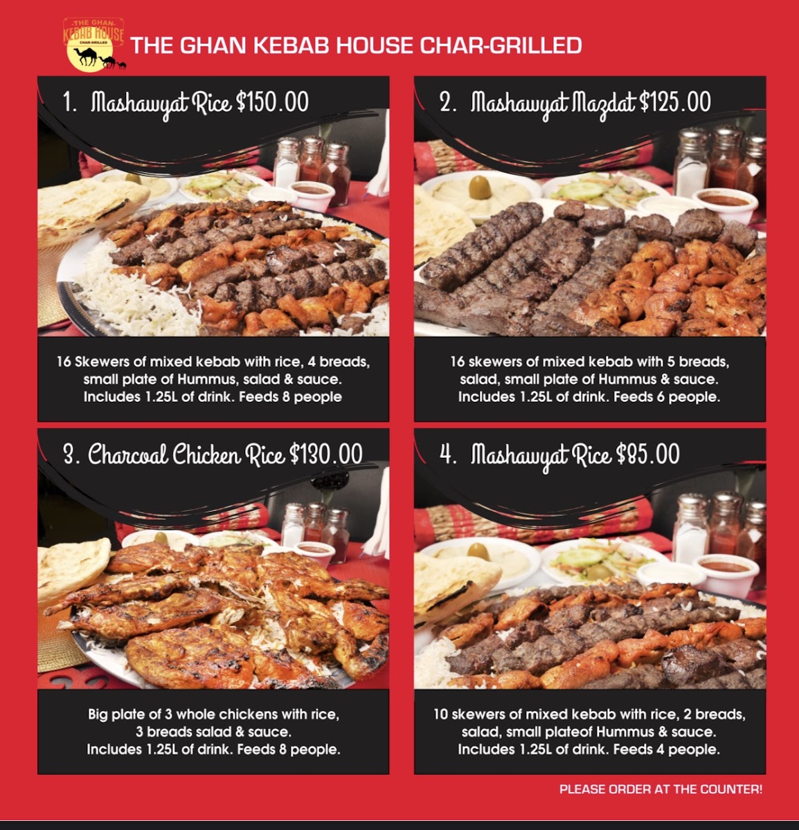 16 skewers of of mixed kebabs with rice, salad, sauces, 4 breads & 1.25L of drink.